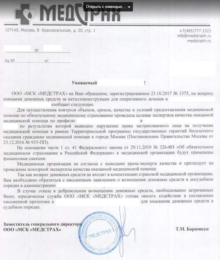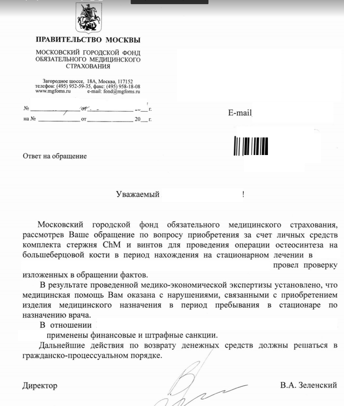 Шаг 1. Пишем письменно в электронной или бумажной форме обращение в МГФОМС (для Москвы или ФОМС своего региона) и свою страховую ОМС. В нем пишем следующий текст: "Добрый день! ДАТА.МЕСЯЦ.ГОД я был госпитализирован по полису ОМС в больницу "такую-то" с диагнозом "ВПИСАТЬ СВОЙ ДИАГНОЗ". ДАТА.МЕСЯЦ.ГОД на обходе врач "ФИО врача" описали диагноз и указали на необходимость проведения операции по остеосинтезу, предложив ставить или пластину или штифт. Выбрав штифт врач сказал что сейчас штифтов в больнице нет в наличии и необходимо приобрести его самому, а операция будет по ОМС. Он дал контакт человека из фирмы которая продает необходимые штифты "УКАЗАТЬ КОНТАКТЫ, НАЗВАНИЕ ФИРМЫ, ФИО КОНТАКТНОГО ЛИЦА", сказал позвонить чтобы узнать стоимость и как оплатить. Связавшись по данным контактам, была озвучена сумма в "УКАЗАТЬ СУММУ" рублей, указав место и время для оплаты. ДАТА.МЕСЯЦ.ГОД по указанному адресу мой представитель "ФИО ПРЕДСТАВИТЕЛЯ" приехал и оплатил оговоренную сумму. ДАТА.МЕСЯЦ.ГОД мне была проведена операция. ДАТА.МЕСЯЦ.ГОД меня выписали из больницы. Прошу помочь разобраться должен ли я был оплатить металл для остеосинтеза или же это проходит по ОМС? И если все должно было быть по ОМС прошу помочь вернуть уплаченную сумму. Спасибо! Полис ОМС: "УКАЗАТЬ НОМЕР ПОЛИСА"".