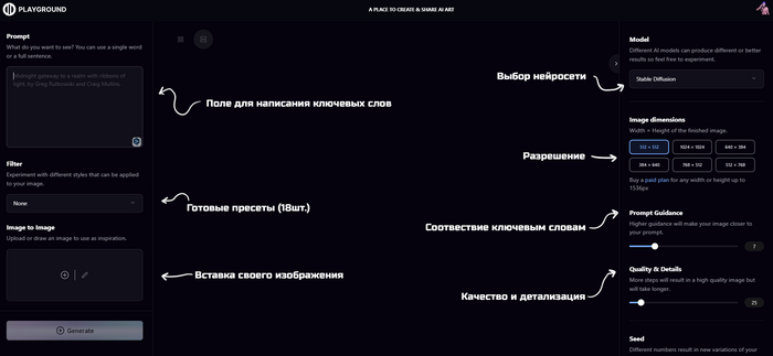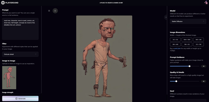 А спустя время наткнулся на нейросеть playgroundai основанной на stable diffusion и DALL·E 2. Там оказалось можно генерировать изображения на основе текста и на основе своего фото или рисунка, что меня привлекло.