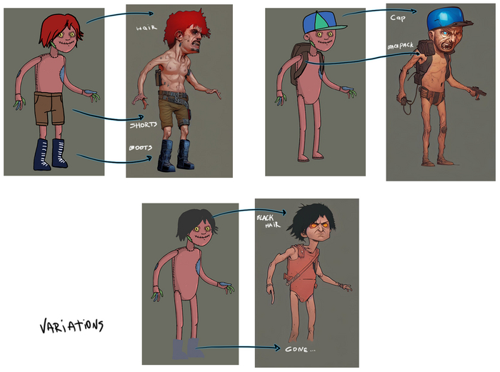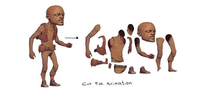 Для анимации я использую программу костной анимации Spine. Нарезаю персонажа на нужные части и он готов к экспорту из фотошопа. Все головы, ремни, жилетки и ботинки можно будет сделать скинами на одном персонаже, что очень удобно и дает вариативность в создании персонажа.