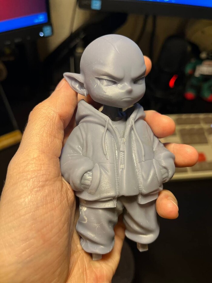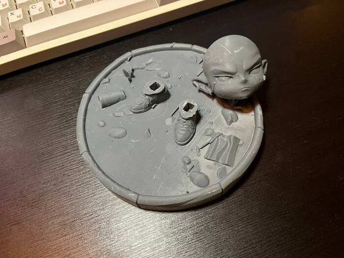 Выполнение заняло больше времени, то принтер барахлил, то смола оказывалась бракованной. Забрал я фигурку по кускам, а тело затерялось где-то дома. Но детализация в сравнении с FDM была на нужном уровне, так что я решил продолжить искать печать с подобной технологией.