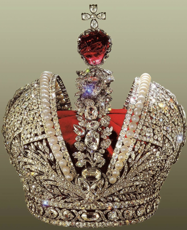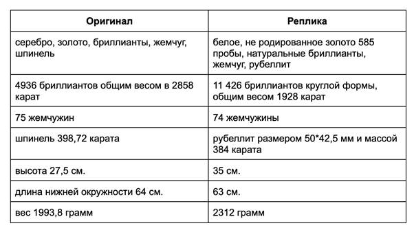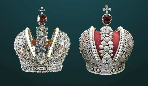 Украшают реликвию свыше 11 тыс. якутских алмазов, австралийские жемчужины, рубеллит вместо гигантской шпинели, а вместо серебра использовано белое золото.
