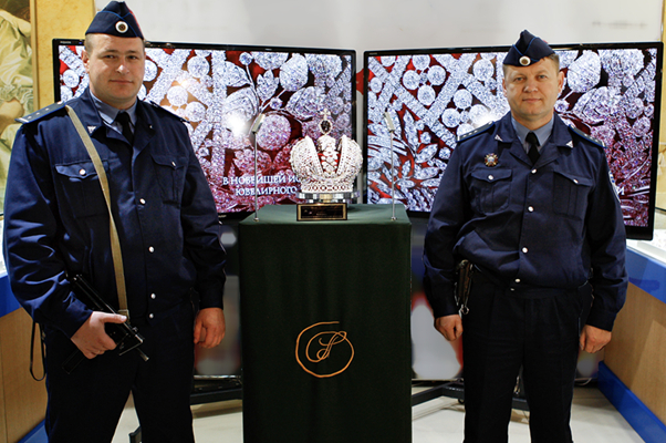 Вооружённая охрана в виде фельдъегерей Спецсвязи сопровождает драгоценную копию смоленских мастеров в турне по российским городам. Кстати, корону также демонстрировали за рубежом. Например, в филиале Эрмитажа в Амстердаме, в Гонконге и Лас-Вегасе.