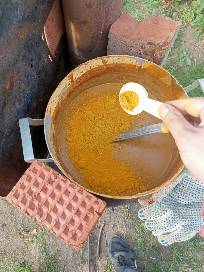 - краситель. Продают на озоне. Выбор основных цветов есть. Пигмент для гипса и цемента. В рецепте 625 гр. Дан объем скорее всего для железного сурика. Я его не нашел. Пигмента надо меньше.
