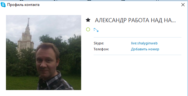 Прилагаю скрин, также любезно предоставленный заказчиком, когда он связывался якобы со мной через скайп. Сам Лжеалександр общался с заказчиком не по голосу, а печатая.