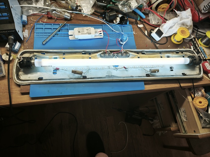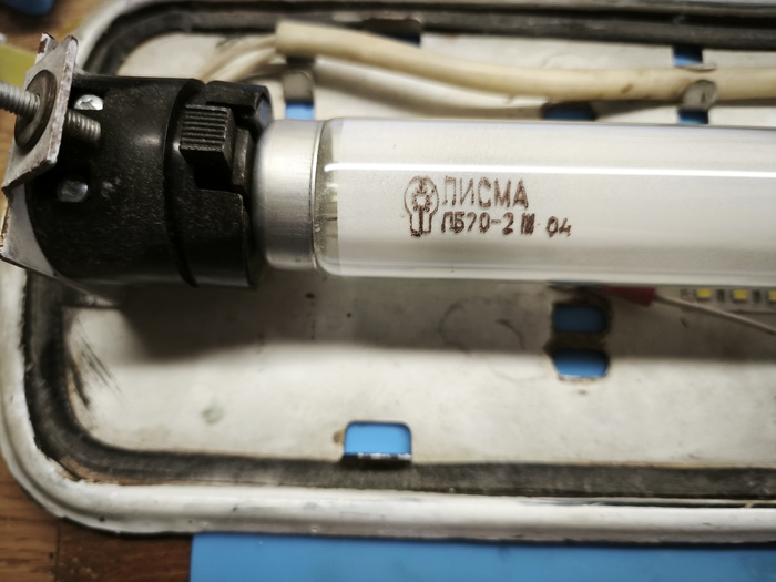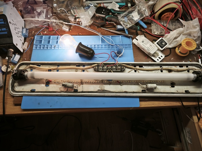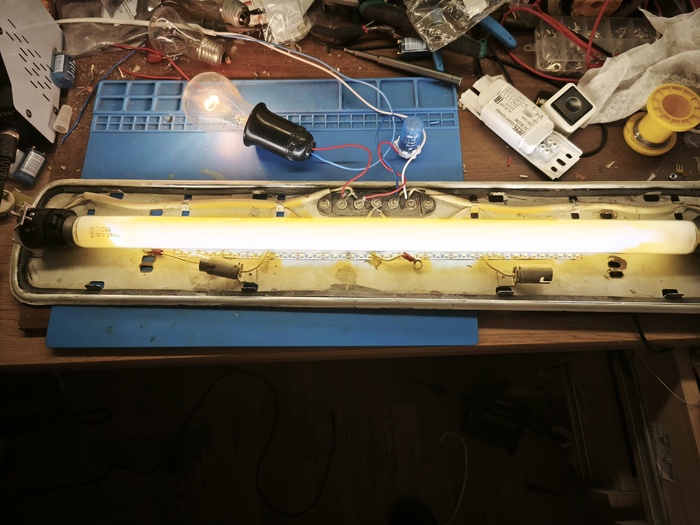 Лампа вспыхивает в такт стартеру, немного горят электроды лампы и старта, как и ожидалось не происходит - нет нужного для старта высоковольтного всплеска. Фиаско? Не совсем. Поставим вместо современной лампы советскую ЛБ20: