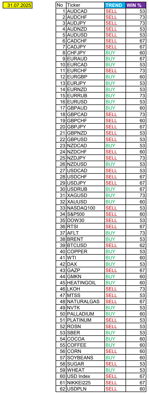 Очередные сезонные тенденции на Четверг 31 Июля 2025 по основным мажорам финансовых рынков.