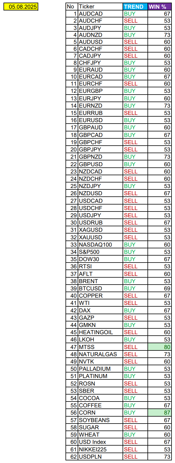 Очередные сезонные тенденции на Вторник 05 Августа 2025 по основным мажорам финансовых рынков.