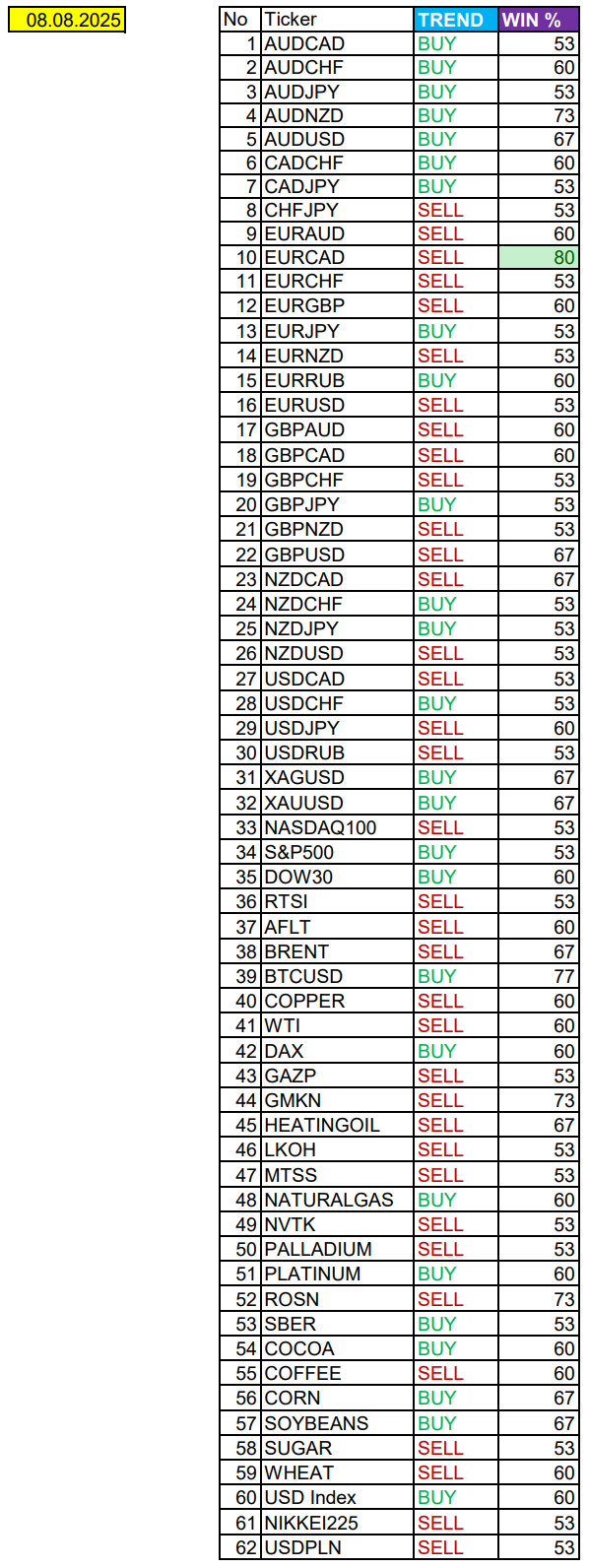 Очередные сезонные тенденции на Пятницу 08 Августа 2025 по основным мажорам финансовых рынков.