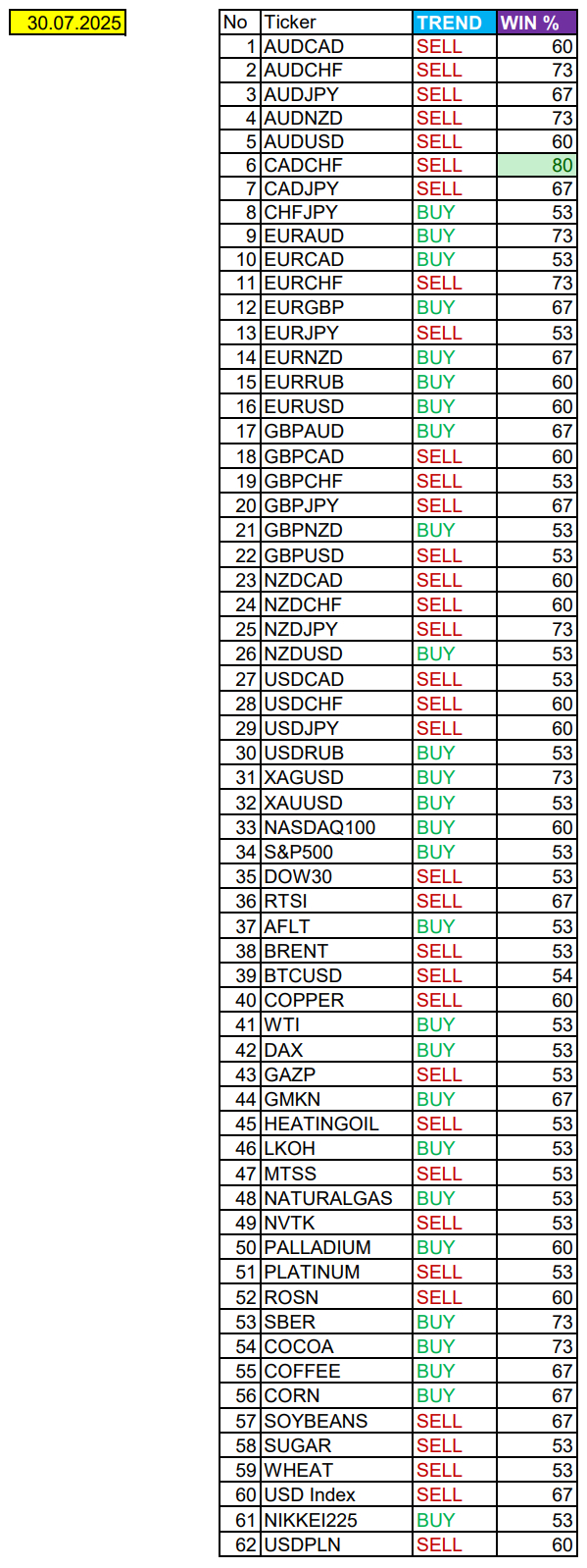 Очередные сезонные тенденции на Среду 30 Июля 2025 по основным мажорам финансовых рынков.