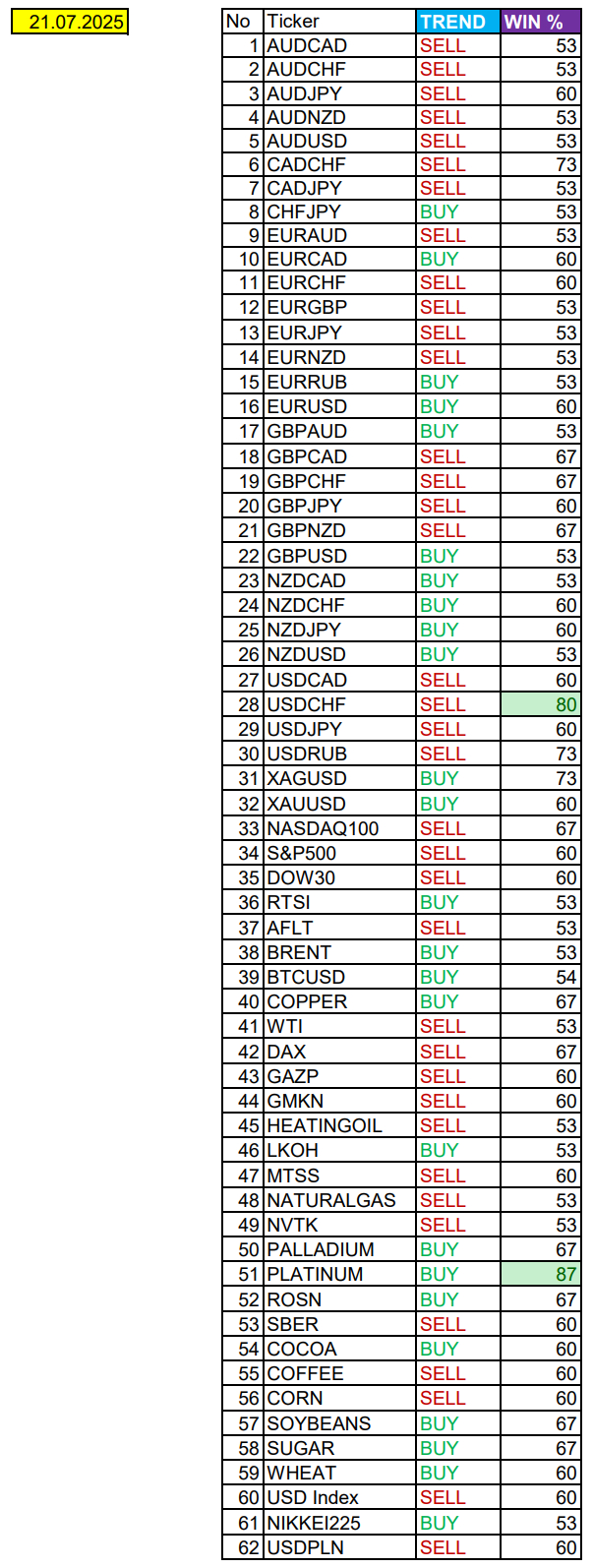 Очередные сезонные тенденции на Понедельник 21 Июля 2025 по основным мажорам финансовых рынков.