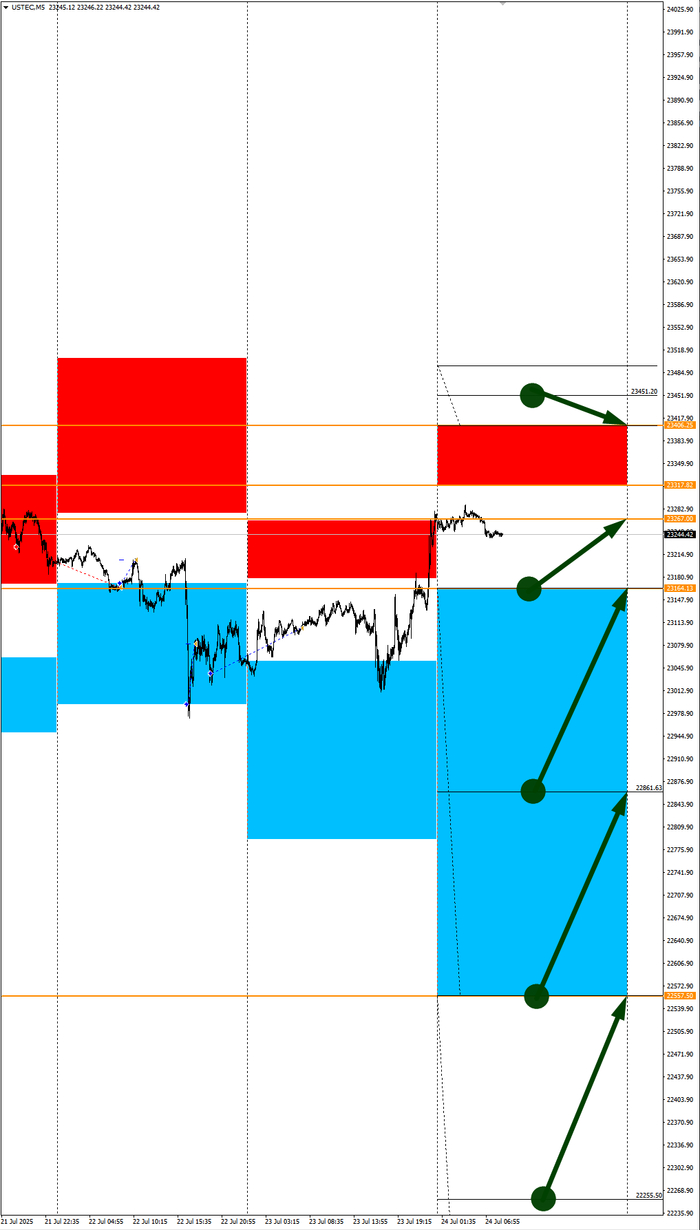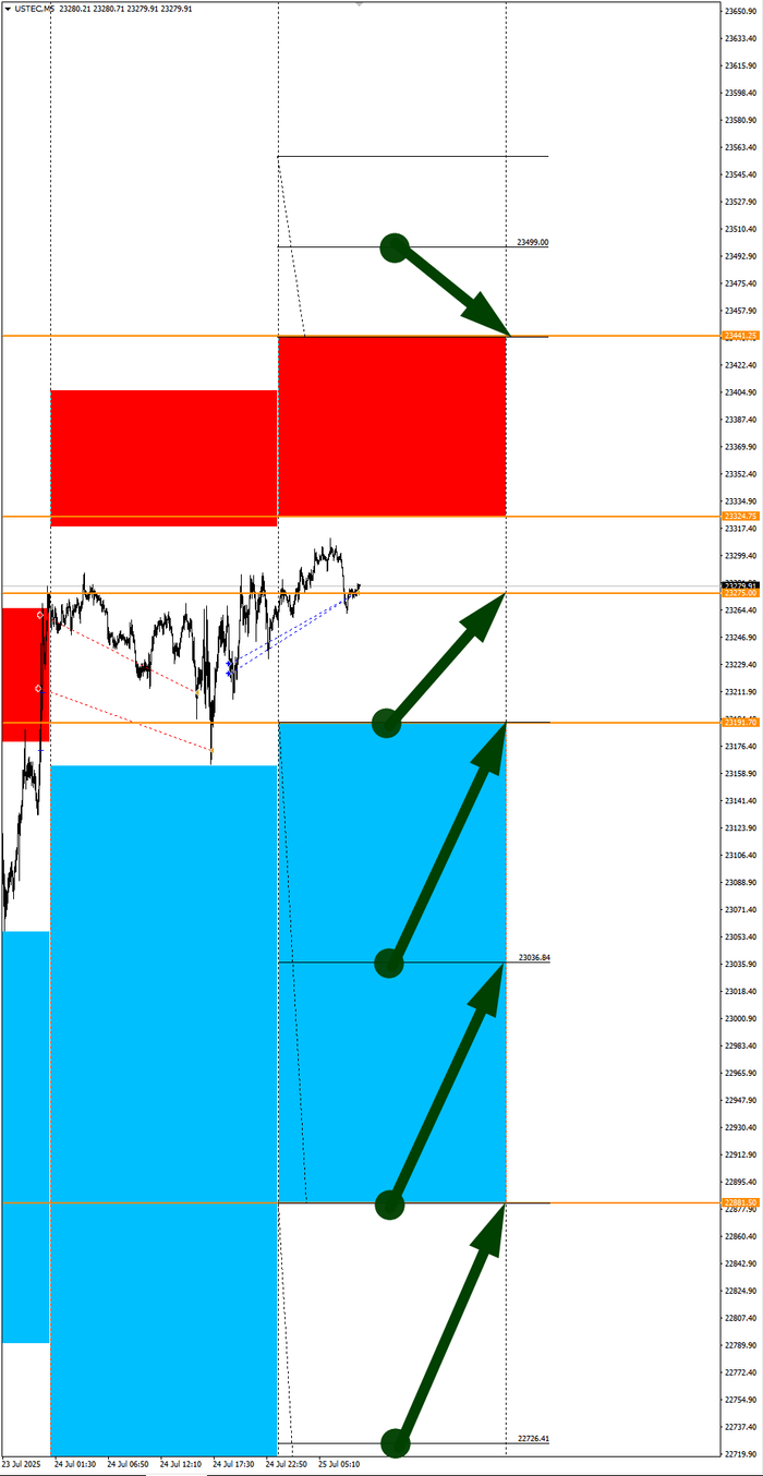 Зона покупок 23164,13-22557,50 с целью 23267,00. Покупки в приоритете пока фон доллара США слабый.