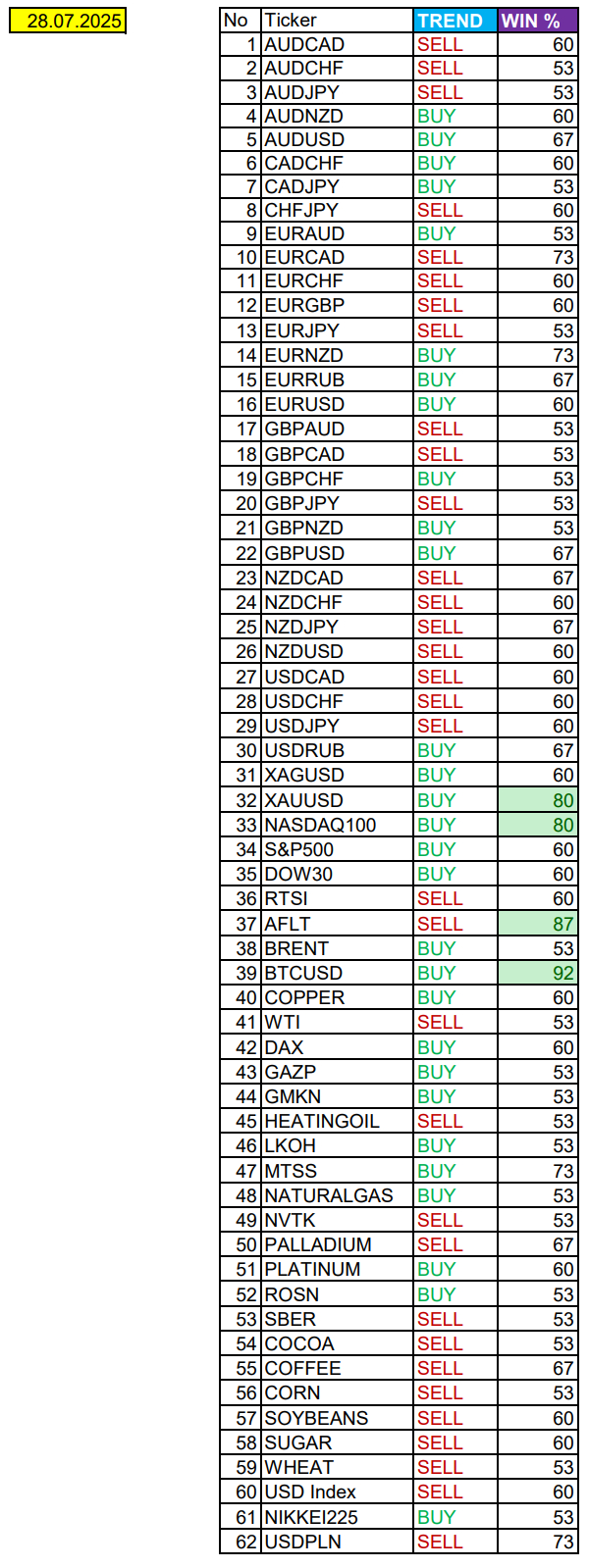 Очередные сезонные тенденции на Понедельник 28 Июля 2025 по основным мажорам финансовых рынков.