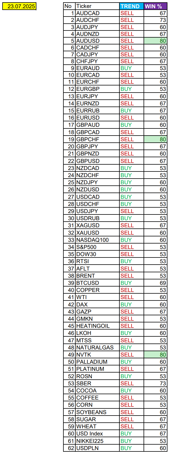 Очередные сезонные тенденции на Среду 23 Июля 2025 по основным мажорам финансовых рынков.