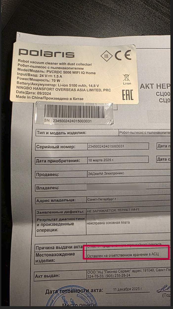 4. В пункте выдачи - меня естестевенно послали. По коду возврата, в их системе бьётся пылесос, а не акт из СЦ. И принять его не могут.