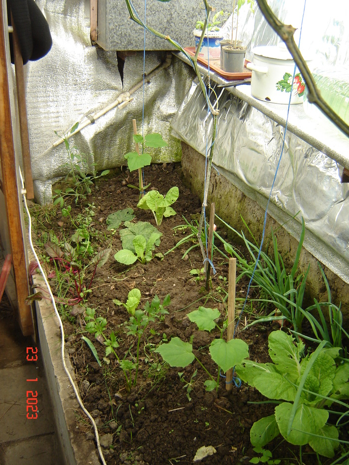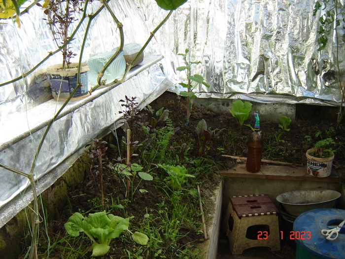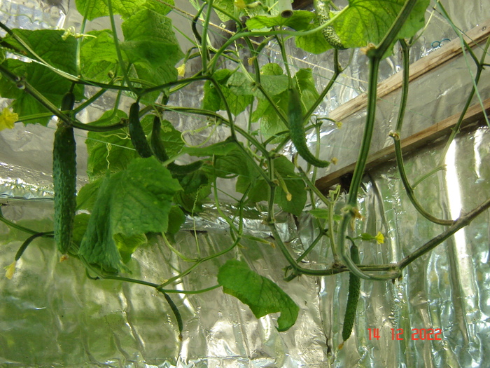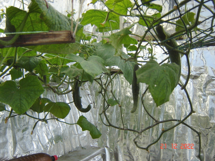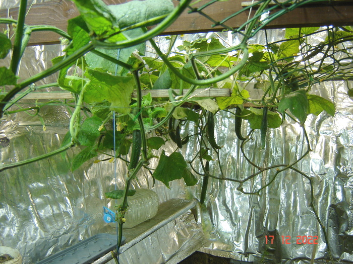Огурцы перестали цвести и образовываться завязи. Пошли " крючки" , " бочонки" , и в конце декабря огурцы закончились. Листва стала желтеть и жухнуть, и из трех огурцов, что росли в теплице, я обрезал плети на двух , а один убрал совсем.