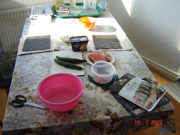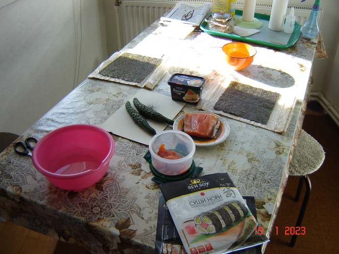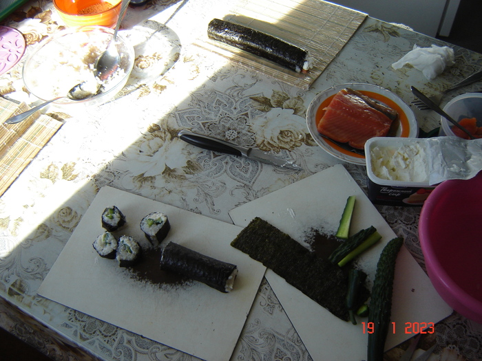 Дней десять сидели мы без своих свежих огурцов и вот после " кардинальной обрезки", огурцы, посаженные еще в начале сентября опять начинают давать урожай. Поэтому решили мы на Крещение наделать суши.