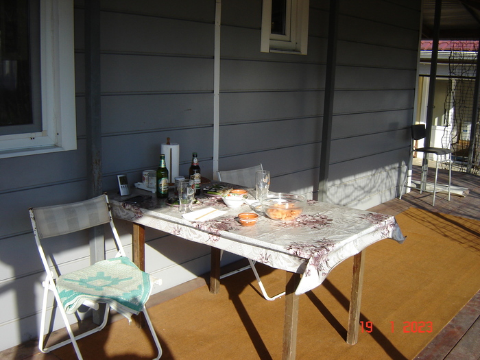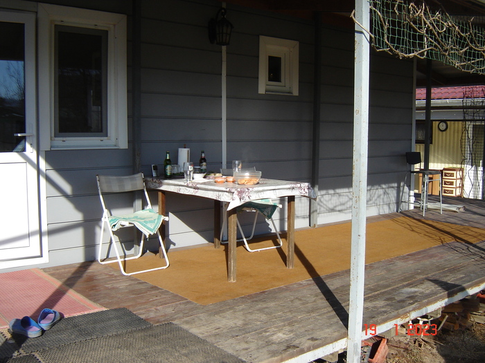 Стол накрываем на улице , единственное неудобство, что солнце ходит низко и освещает всю площадь террасы.