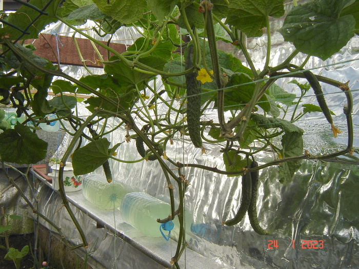 Один огурец, я видимо, обрезал не до конца и он не погиб, рос сам по себе, поливал его только дождь, а я не обращал на него никакого внимания, копошился наверху с переделкой крыши. Хотя было видно, что он вдруг покрылся молодыми зелеными листьями. И когда я, наконец, спустился вниз, то обнаружил, что огурец будто заново родился, пошли свежие плети и навязались хорошие огурчики. И этот случай побудил меня попробовать обрезать кардинально огурцы в конце их жизнедеятельности. Т.е. обрезаю я все плети, оставляю только одну, самую " живую" или нижний пасынок, если он есть. Не все, правда, огурцы переносят такую обрезку, но некоторые просто оживают и начинают расти по - новой. Несколько успешных примеров такой обрезки у меня получилось. Посмотрим, как это выглядит в этом году.