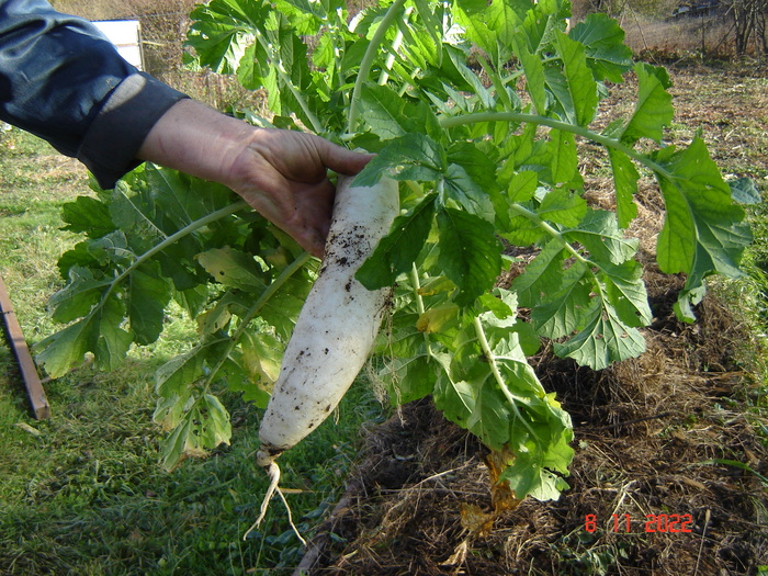 Дайкон, как обычно, вырастает просто огромных размеров и совсем не боится заморозков.