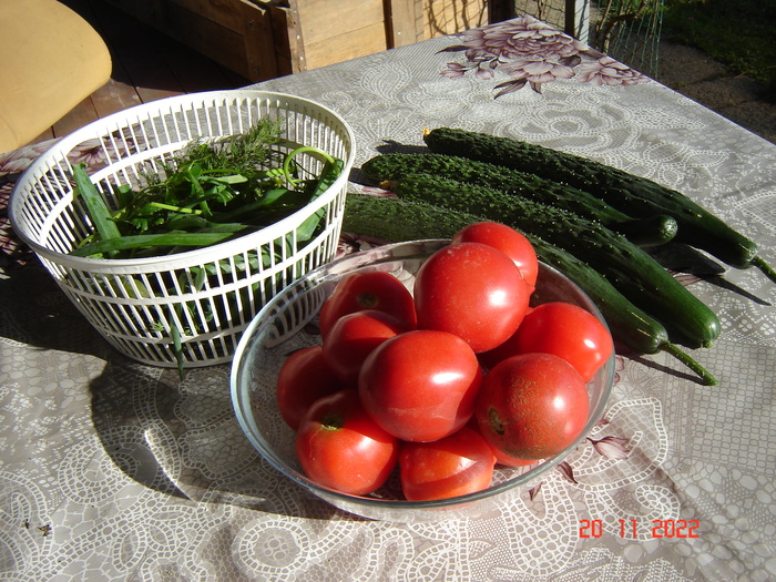 Сегодня настолько тепло, что сели обедать на улице, на террасе, на открытом воздухе. А это наш сегодняшний урожай.