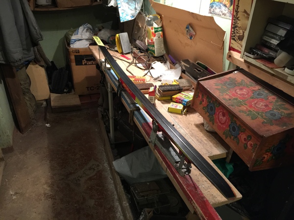 Вот так выглядит место, где все это происходит. Лыжа намертво закреплена. На столе все, что нужно: сам парафин, утюг, для его плавления, разные щетки и т.д.