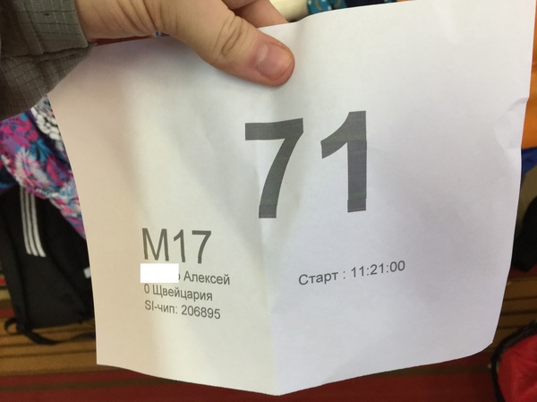 Каждому участнику выдается номер, на котором напечатана вся информация о нем: время старта, имя и фамилия, команда и номер чипа.