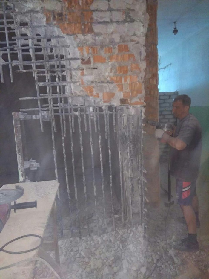 После начала вскрытия увидели- стена в два пустотелых красных кирпича пролитые раствором о разборке не может быть и речи, 12-14 сантиметров бетона армированных двойной сеткой, арматура 14. Ячейка сами видите какая.