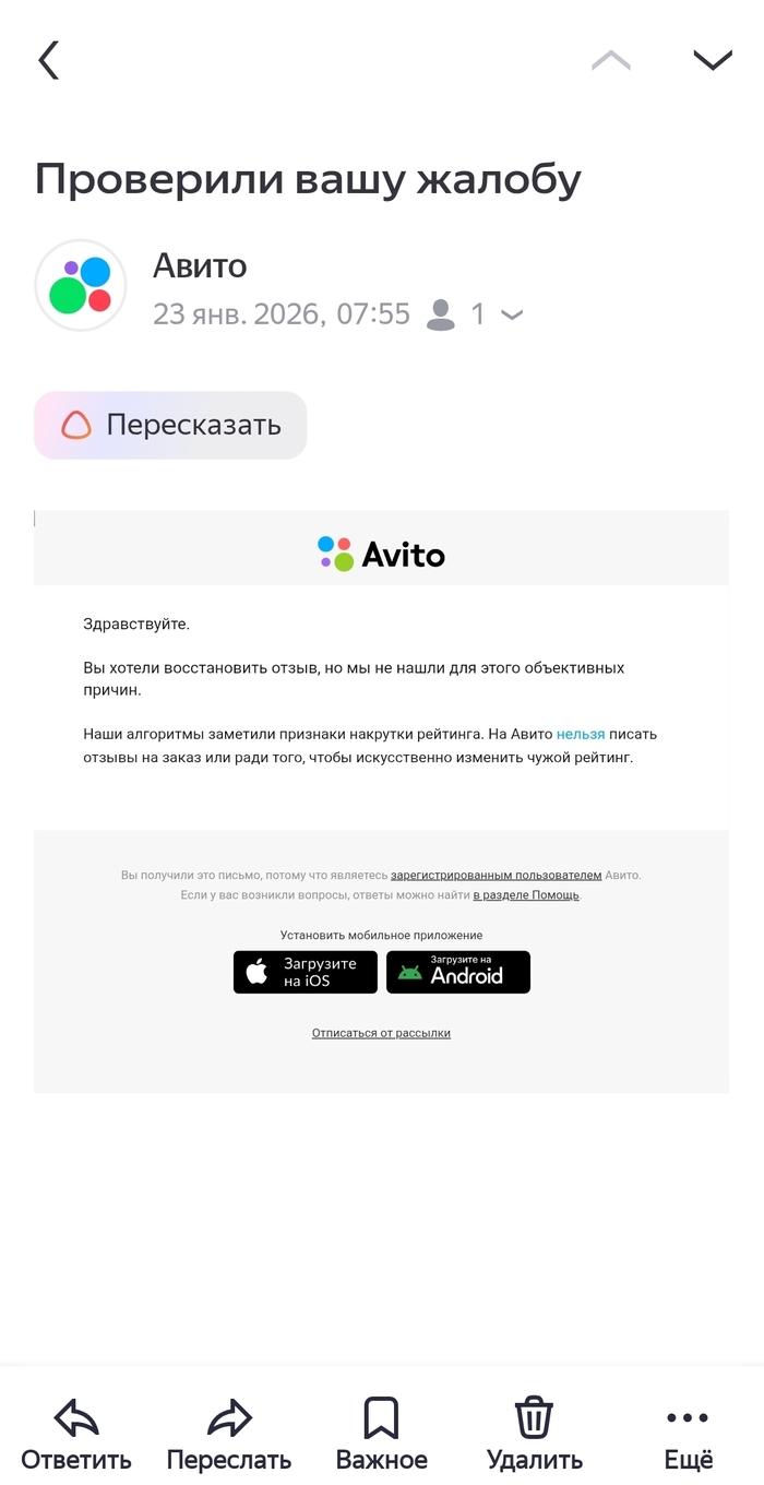 Причем в жалобе, я пытался опротестовать и прислал им скрины переписки с продавцами, где видно, что человек сделал свою работу и мне она понравилась, но увы, бездушная машина Avito непреклонна. Вот потом и орентируся, что за продавец, а ведь хотел сделать доброе дело...