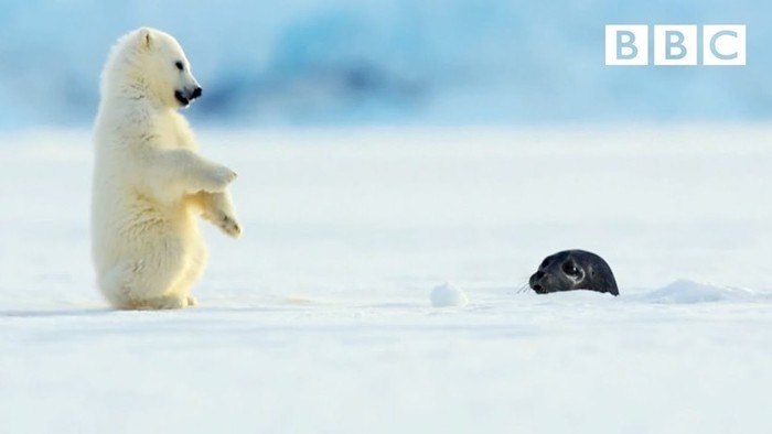 Белые — это самые большие медведи в мире. Они обитают в холодных условиях и представляют собой грозных и опасных хищников — быстрых, сильных, решительных. Лучше избегать встречи с ними, потому как нападение на человека им свойственно. Люди — это такая же еда, как тюлени, моржи или рыба. Однако медведи отличаются благородной красотой, а потому за ними так интересно наблюдать. Они кажутся мягкими, пушистыми и неуклюжими добряками. Особенно медвежата. Канал BBC, делая видео о жизни полярных медведей, снял забавный кадр, как медвежонок напугался тюленя.