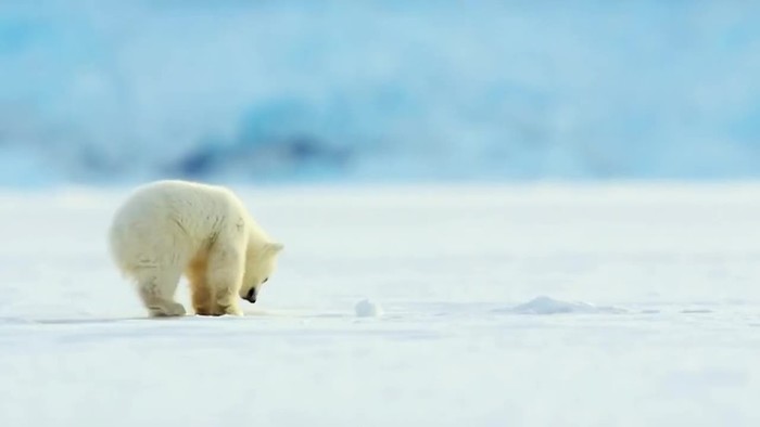 «Под полярными льдами часто находятся подземные резервуары с водой, в которые можно попасть через проруби. Там плавают тюлени. Каждые 30 минут они должны вдохнуть воздух. Для этого животные выныривают из проруби. Медведи очень наблюдательные охотники и знают об этом. А потому они ложатся у одной из прорубей и ждут, пока добыча сама не выплывет наружу. Сейчас мама-медведица преподает своим детенышам урок терпения», — комментирует диктор.