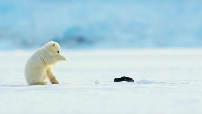 «Девочка, кажется, серьезно отнеслась к обучению и ждет рядом с мамой. Однажды малышке придется самой добывать себе пищу, и надо знать, как это делать. Но ее брат предпочитает играть со снежками. Ожидание наконец-то закончилось. Тюлень выплыл, чтобы сделать вдох. Но он выбрал не ту прорубь, где лежала медведица, а ту, что рядом с медвежонком. От неожиданности малыш пошатнулся и упал. Тюлень же исчез под водой»