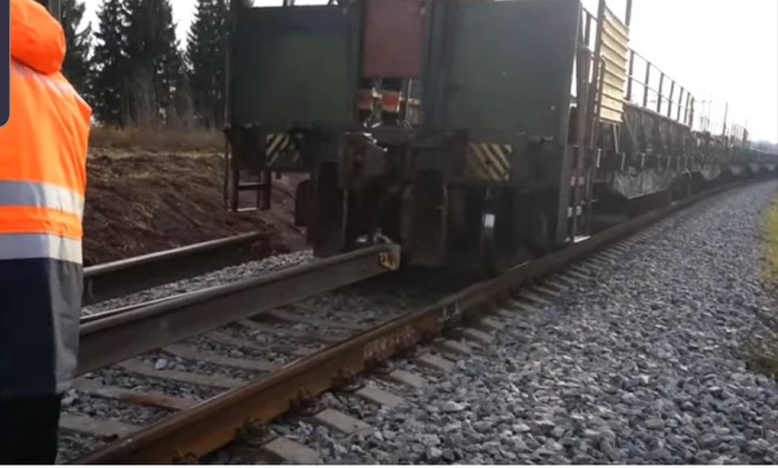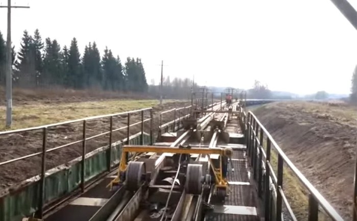 В итоге мы получаем 800 метровую плеть. После наполнения рельсовозного поезда плети увозят в место укладки и выгружают прямо в колею.