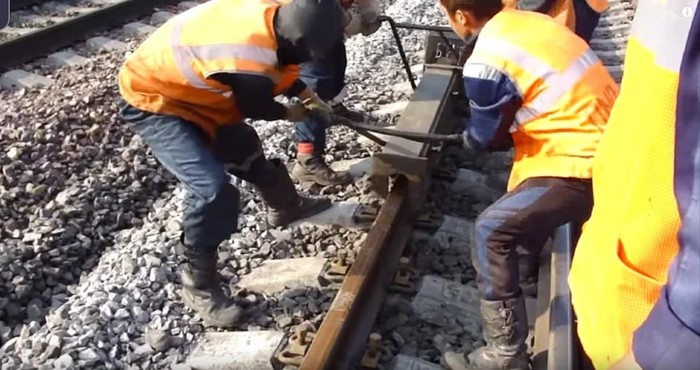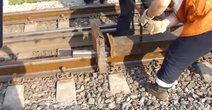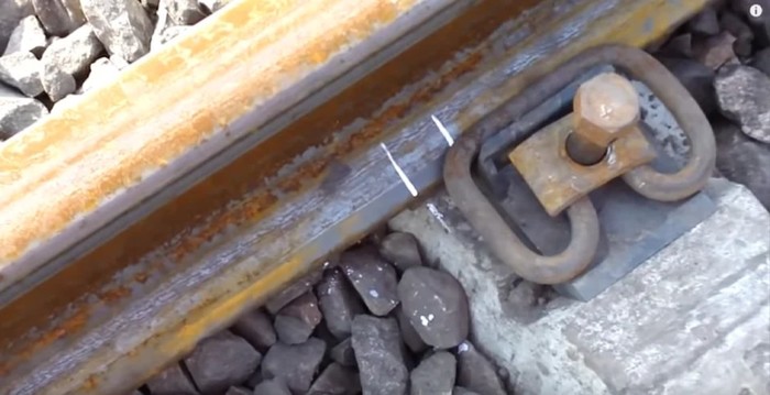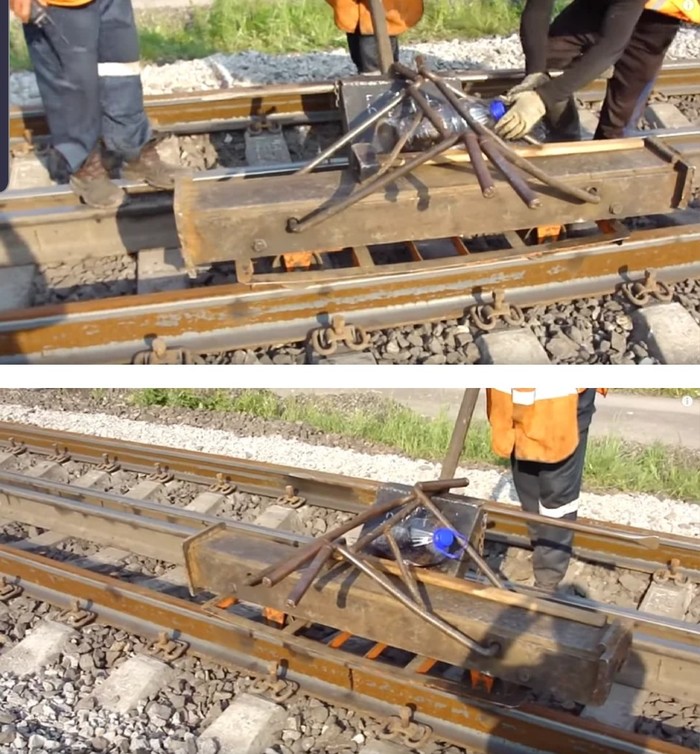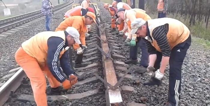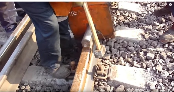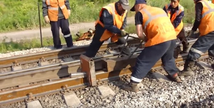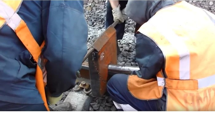 Но есть способ еще интереснее. Когда нет готового ударного прибора, то в ход идет обычный кусок рельса, клещи и десяток путейцев.