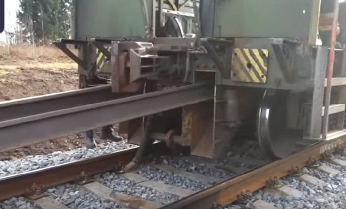 После того как состав доехал до конца плети рельс подтягивают лебедкой, чтобы она полностью "заехала" на состав.