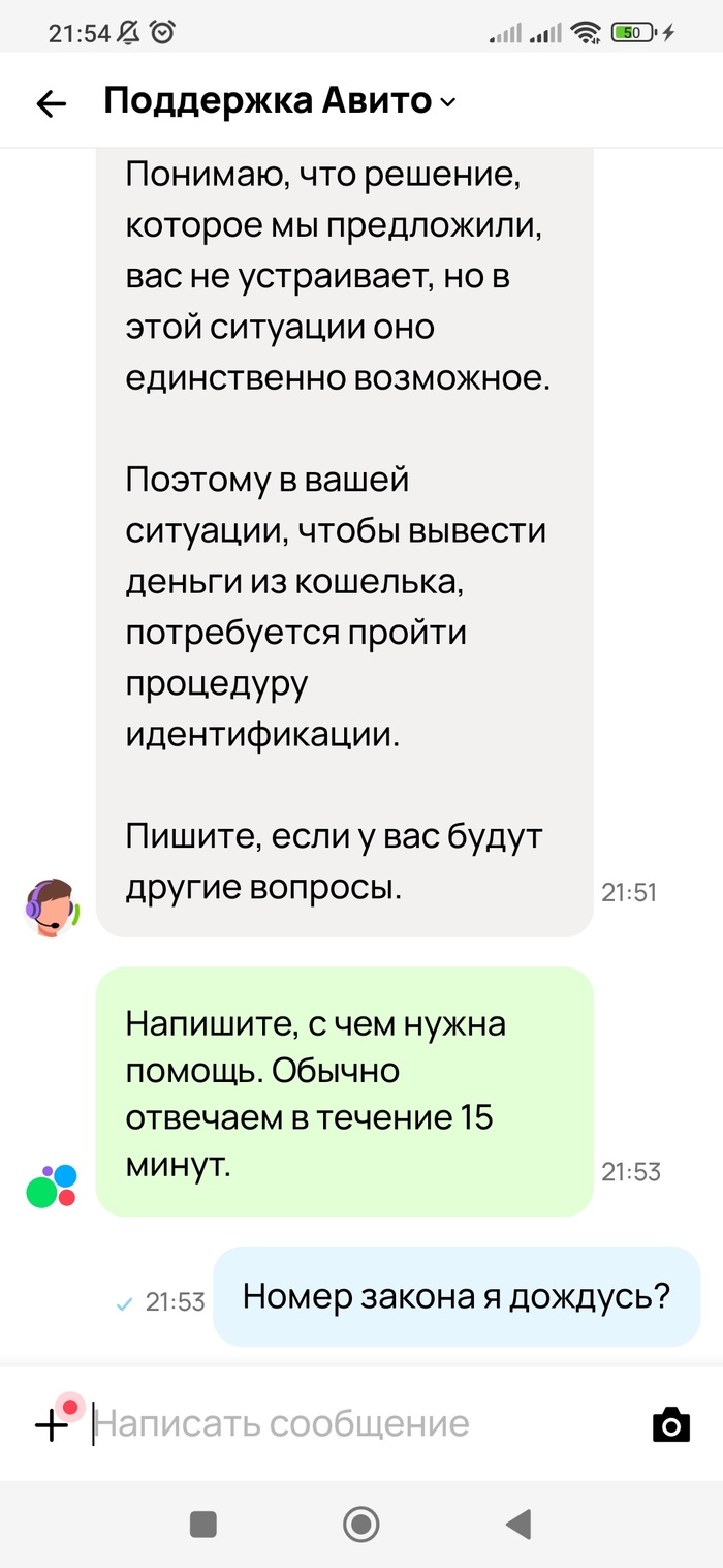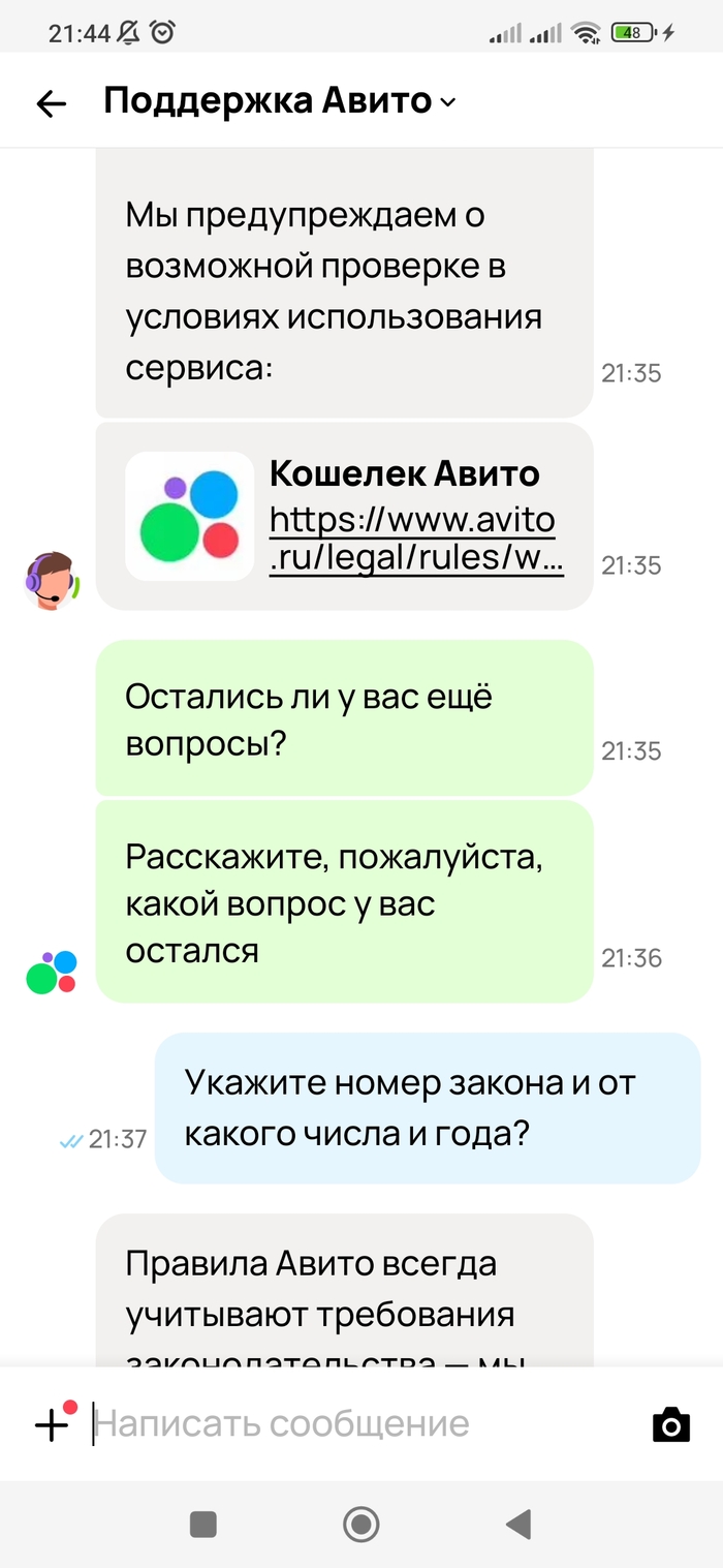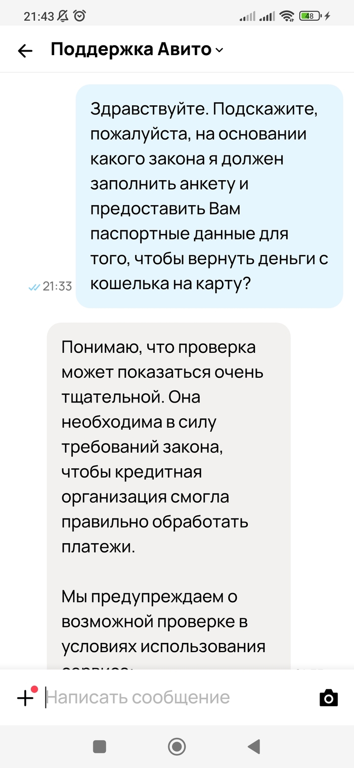 Народ, подскажите, кто был в такой ситуации: заказал товар на Авито, пытался связаться с продавцом, что оплатил, чтобы он отправил, однако до продавца так и не дозвонился и отменил заказ. Деньги вернулись в кошелёк Авито. Хочу вывести на карту деньги, но надо заполнить анкету, где я должен указать свои паспортные данные, год рождения, ФИО. Пишу в поддержку с чего вдруг такие танцы с бубном- пишут на основании закона. Прошу указать номер закона, морозятся.