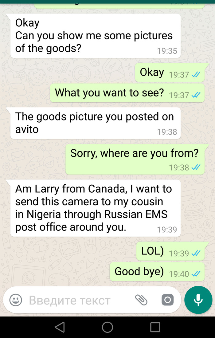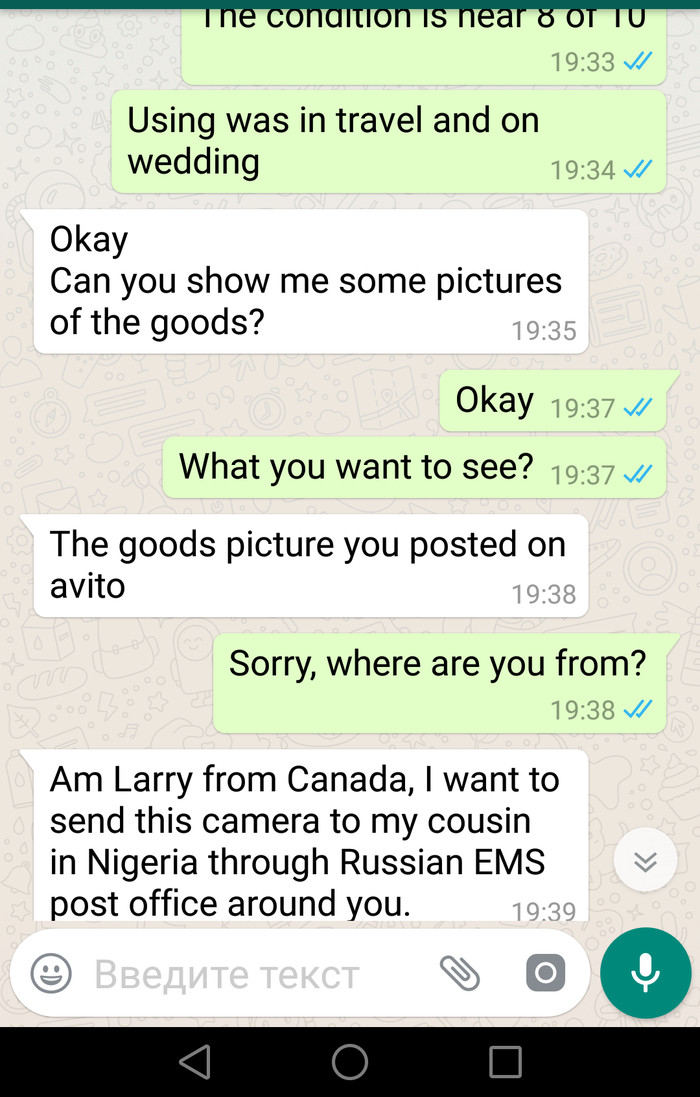 Разместила на Авито объявление о продаже фотоаппарата. Не прошло и получаса, в Вотсап стучится некто с номером +1(408)... Ну, думаю, ладно, гляну. А там речь как из учебника, что настораживает. Ниже скрины переписки. И внимание, вопрос: мошенники или я упустила выгоднейшую сделку?