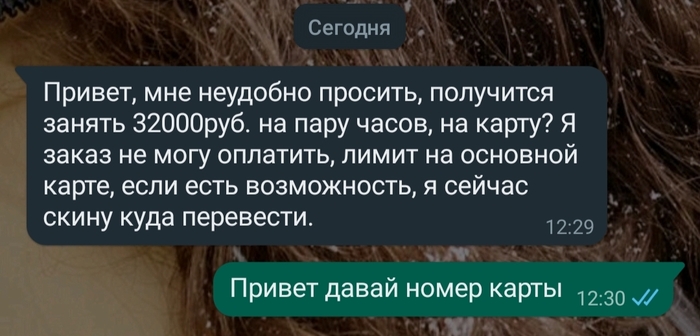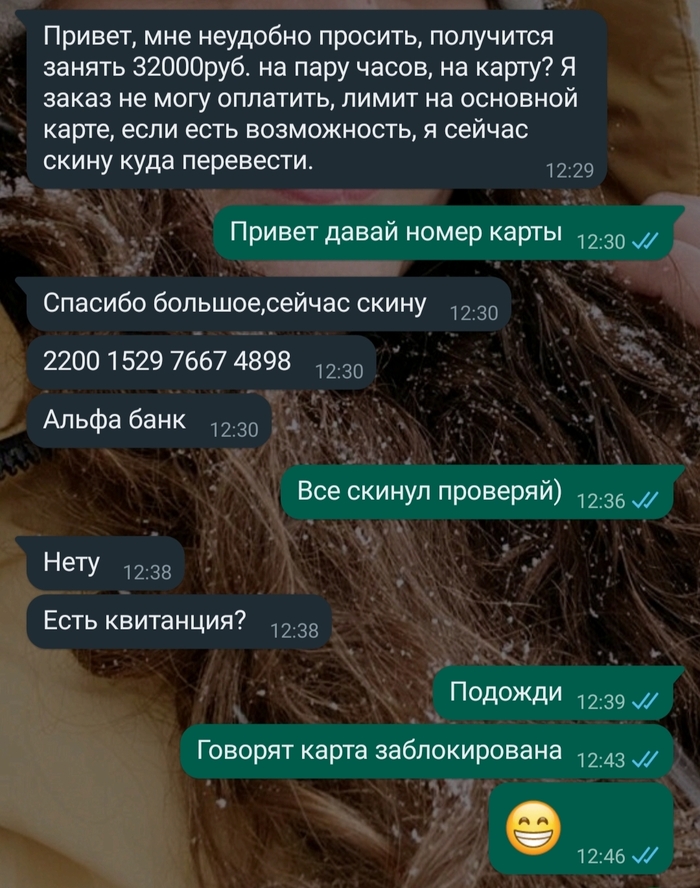 Ну я тоже про мошенников вставлю свои 5копеек. Сегодня буквально во второй раз за год у коллеги по работе каким то образом взламывают what'sApp. Я это понял после того как с его рабочего аккаунта приходит сообщение с просьбой о донате на его карту) Ну в общем судя по тексту в сообщении пониманию, что это не коллега, так как буквально 2 недели назад был аналогичный случай с другим парнем из нашей фирмы и судя по тексту читалось откровенно, что пишет мошенник. Ну думаю сейчас немного подыграю и помогу мошеннику остановить свою деятельность. Пишу конечно давай номер карты.