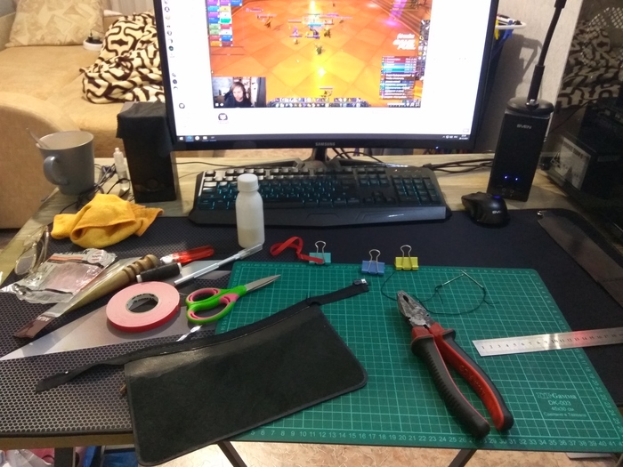 Немного о изделии. Подглядел в бесплатных выкройках на просторах интернета. Оригинал шел с кнопкой, но так как я пока нищ на инструменты, сделал без фурнитуры. Так вот, выкройка была на другой шаг пробойника, и было принято решение запилить что-то похожее в Autocad-e. Благо основная работа дала мне небольшой, но всё же, опыт работы в данной программе. Прикинув, кхе-кхе, руки к голове, стал чертить. Подглядел технику построения пробоя у небезызвестного Сережи, и видимо не туда глядел. Будучи распечатанной, выкройка была неправильного масштаба (спустя несколько шагов пробойника, зубья начинали потихоньку съезжать с размеченных точек). Шов получился кривой(( Думаю, нужно шаманить с масштабами в программе, до этого чуть позже дойдут руки.