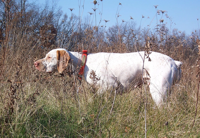Elk Run Kandy Corn (США), бело-рыжий. Собака с куцым от рождения хвостом, в стойке на дичь.