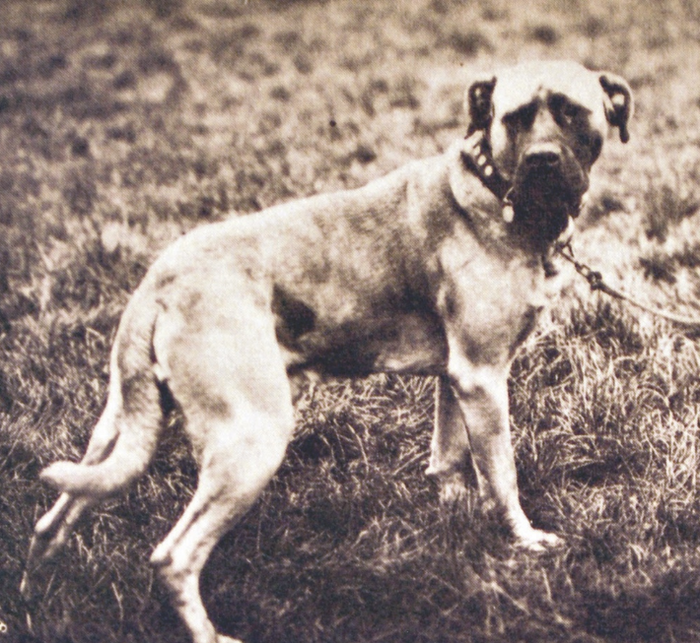 Thorneywood Terror, примерно 1900 год, так называемая "ночная собака егеря", предковая форма современных бульмастифов. Крупные собаки, представлявшие собой помесь мастифа, бульдога, изредка - ещё и бультерьера и немецкого дога.