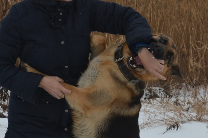 Итак, дело было весной, на удаленной турбазе. Моя немка чинно сидит на поводке у беседки (сука, взрослая 40+кг, воспитанная - поводок для других отдыхающих, чтоб небыло наездов со стороны мимопроходилов). Я иду в домик за чашкой (крыльцо, расстояние 15-20 м, туда и назад), вхожу в домик и тут же сзади слышу вскрики девушек-коллег, разворачиваюсь. Метис кавказа несется к моей Иштар на всех порах и тут же атакует. Размером пес существенно превышает ее. Пока я долетаю до них, успевает вцепиться в нее, но не сильно, я повисаю на нем и начинаю оттаскивать - на шее у пса обрывок веревки, за него и тяну. Пес всем масштабом разворачивается и кидается на меня, целит в лицо, а достать не сложно - во мне 160 см роста.