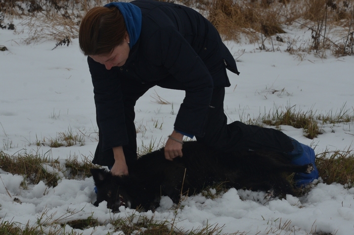 На более мелкую собаку можно просто сесть и подержать, пока не остынет (или пока помощь не придет)