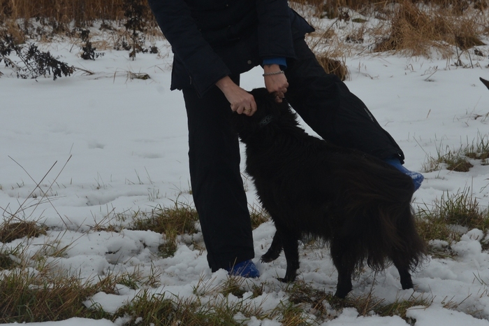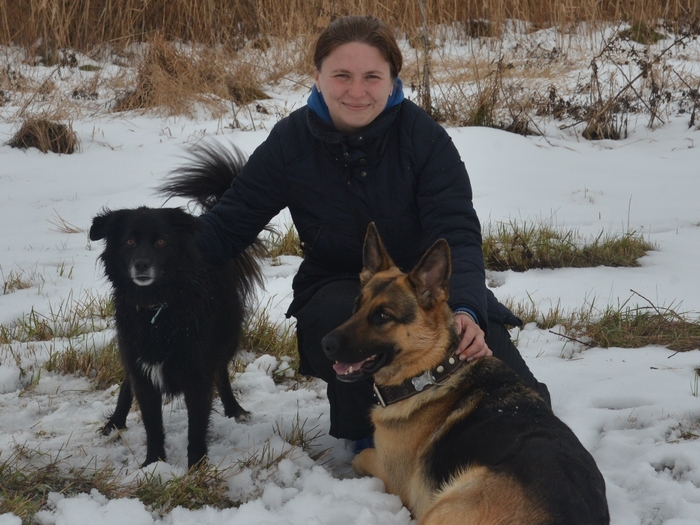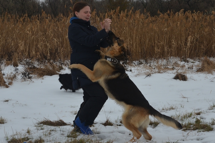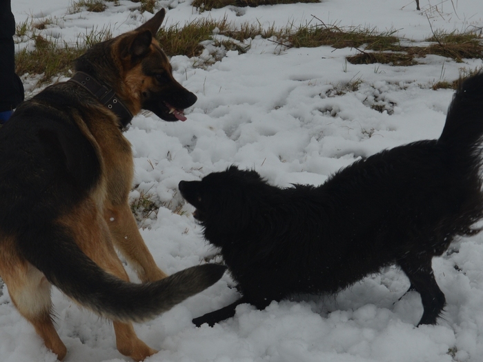 Участники - собственно я, Иштар, немецкая овчарка, после коррекции поведения во взрослом возрасте (агрессия, отъем у владельца, заводчик отстранился), совершенно не агрессивна, чаще пуглива. Исключение - если кто-то на меня агрессию проявит. Шайтан - мелкий метис с выраженными признаками ньюфауленда, рос у меня с полугода. Помимо базового воспитания обучен к общению с собакофобами - его можно как угодно вертеть, совать руки в пасть, переворачивать, умеет атаковать по команде того, кто команду подает, при испуге или на "Фу" немедленно прекращает.