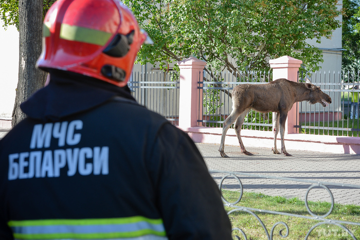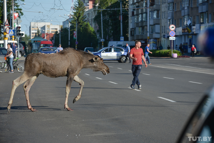 Однако шумовые эффекты не помогли: в какой-то момент напуганный лосенок по диагонали пересек проезжую часть и скрылся во дворе пятиэтажки по улице Минской, в нескольких кварталах от здания горисполкома.