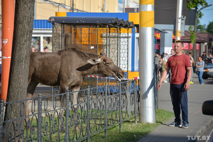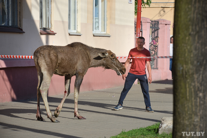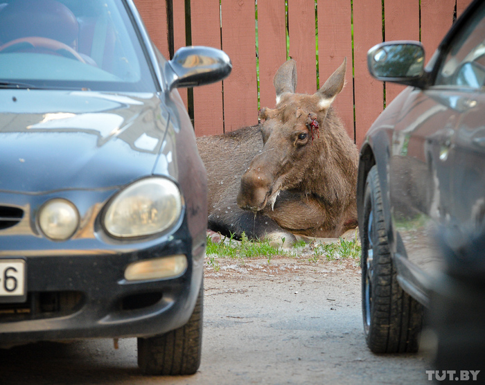 Любопытные бобруйчане побежали следом за животным, вооружившись мобильниками. Многие открыто возмущались тем, что лося до сих пор не усыпили и не осмотрели: из раны на голове у него сочилась кровь. Во дворе напуганное животное забилось в небольшой проем между припаркованными машинами и забором. Все въезды на придомовую территорию тут же были перекрыты.