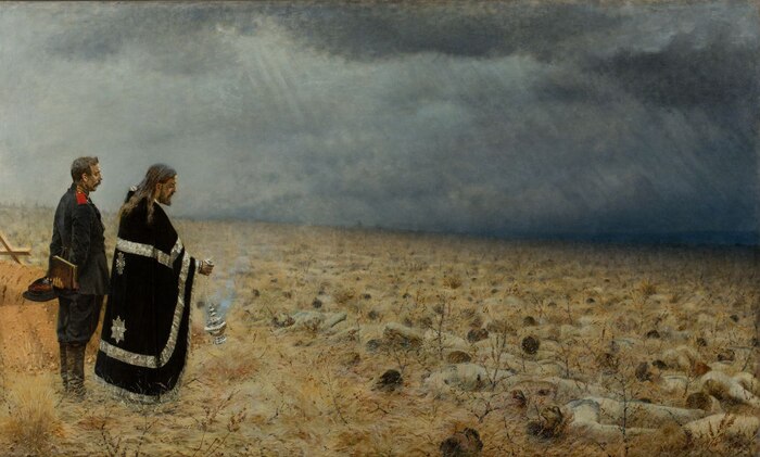 Завершаю короикий рассказ о Верещагине картиной из "Балканской серии" "Побежденные.Панихида" о последствиях поражения Русской Армии в битве у Телиша. Здесь он уходит от детальной прорисовки людей, как это было в его туркестанской серии. На переднем плане 2 человека- полковой священник с кадилом и офицер. Лица лишь угадываются, нет детальной прописи портретов, то есть это скорее изображены функции в виде людей, как некие социальные роли. Перед ними поле, на котором до горизонта лежат трупы убитых, где каждая тёмная кочка-голова, а в поросле на поле угадываются тела. В противопоставлении земле- огромное серое грозовое небо задает тон трагичности и безысходности, серебряная кадильница из которой идёт дым к небу- аллегория перехода душ павших. Слева за фигурами насыпь песка для могилы и простой деревянный крест.
