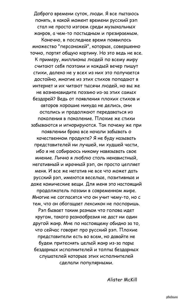 AlisterMcKill 12 лет назад Обидно стало Накипело. На пикабу все чаще появляются посты выставляющие русский рэп в некрасивом свете. Меня они задевают, буду честен. [моё] Русский рэп Досада Надоело