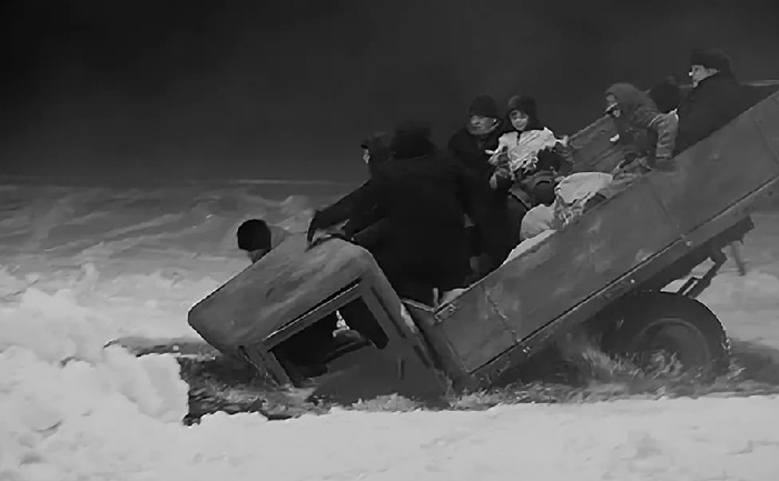 Пытаясь маневрировать под нацистской бомбежкой, попал в полынью — машина быстро погружалась на дно, а водителю чудом удалось открыть дверь и вынырнуть из ледяной воды.