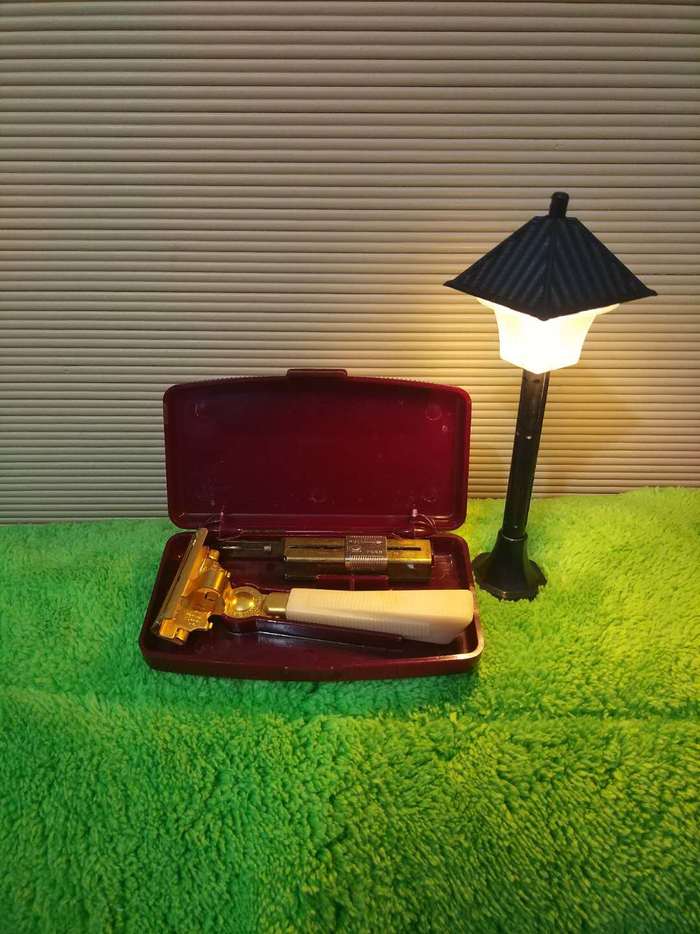 Станок изготовлен скорее всего из алюминия и покрыт под золото, ручка пластиковая или бакелитовая, вес вместе с лезвием 31грамм, поставлялся в коробочке с лезвиями.