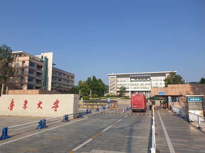 Главный вход в универ, восточные ворота. Здесь пропуск в институт по файс айди. Универ окружен забором с колючей проволокой, с 23.00 до 5.00 все ворота и проходы закрываются, однако все это не помеха для наших студентов. На каменной плите - название универа - ludong daxue. На заднем плане главная библиотека.